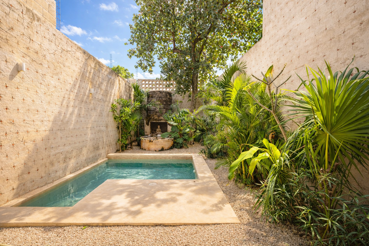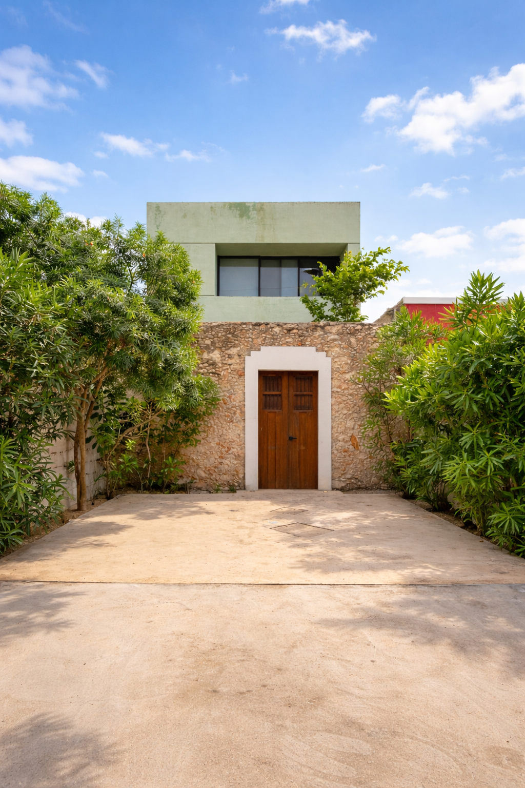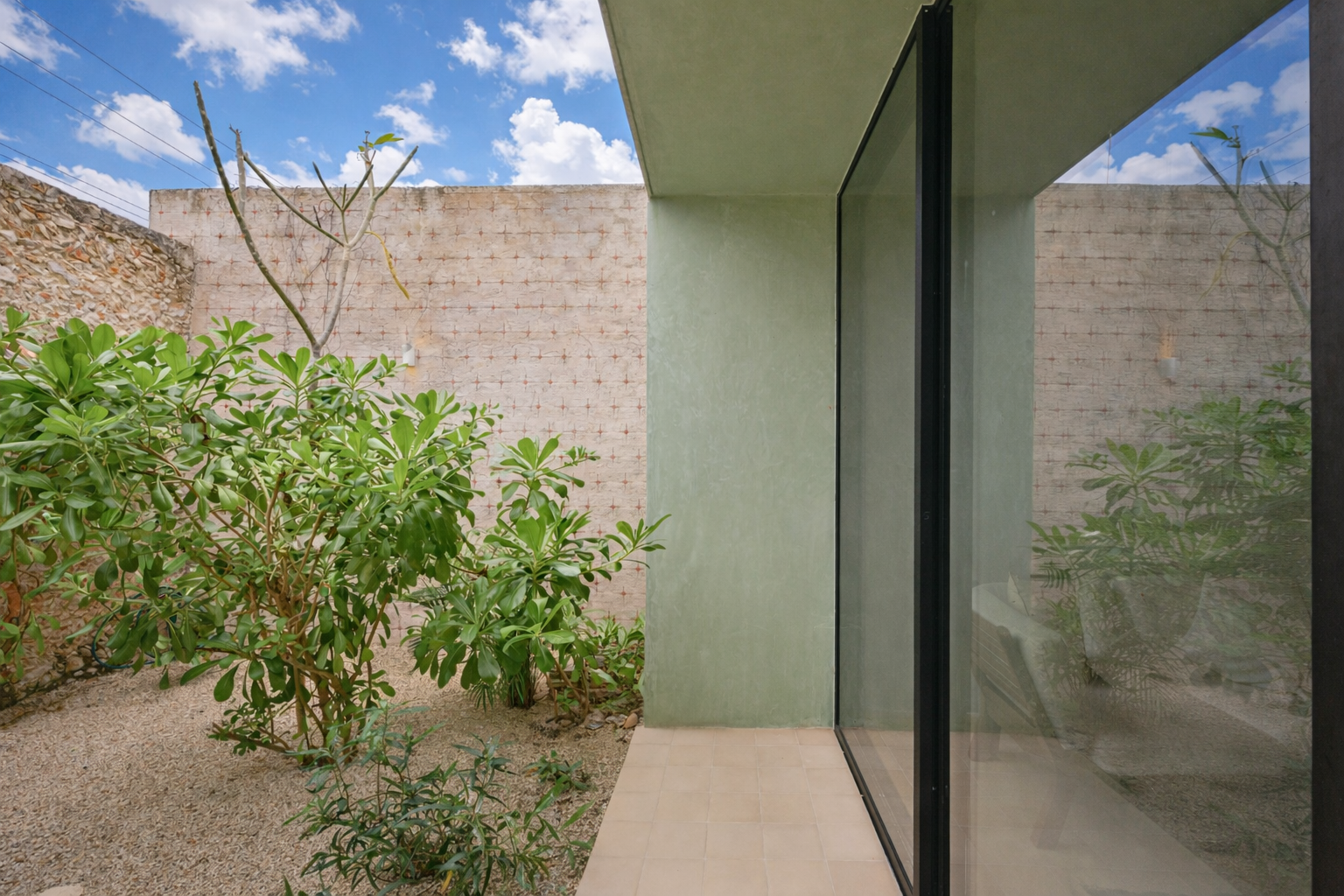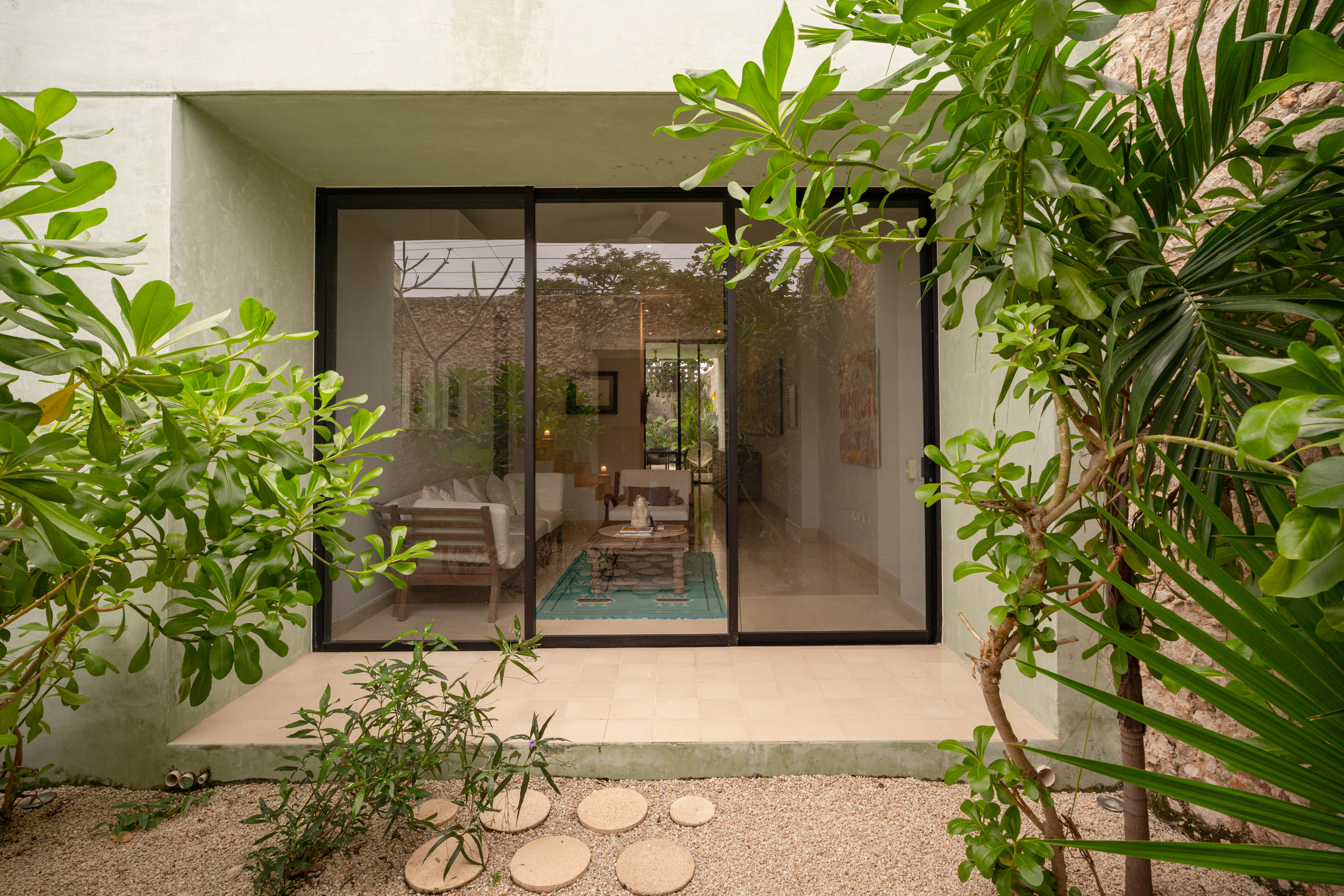 The façade preserves its original masonry (mampostería), discreetly integrating a garage without compromising the historic identity. Upon entering, subtle accents of green chukum appear on select walls, adding freshness and warmth.