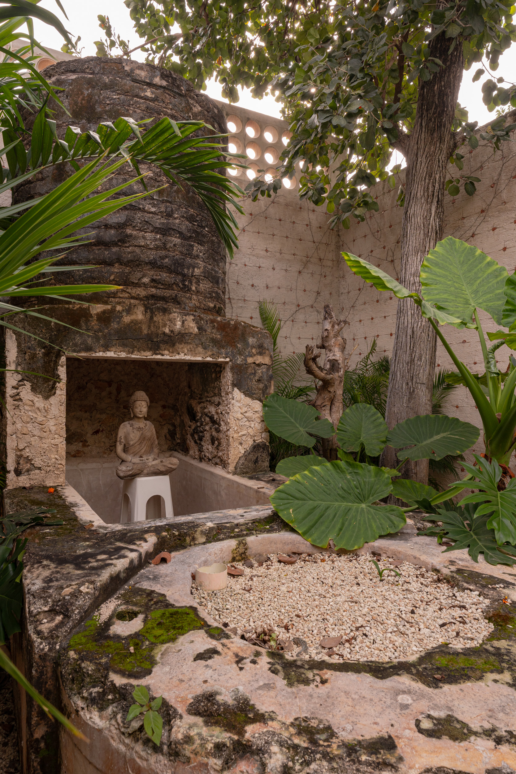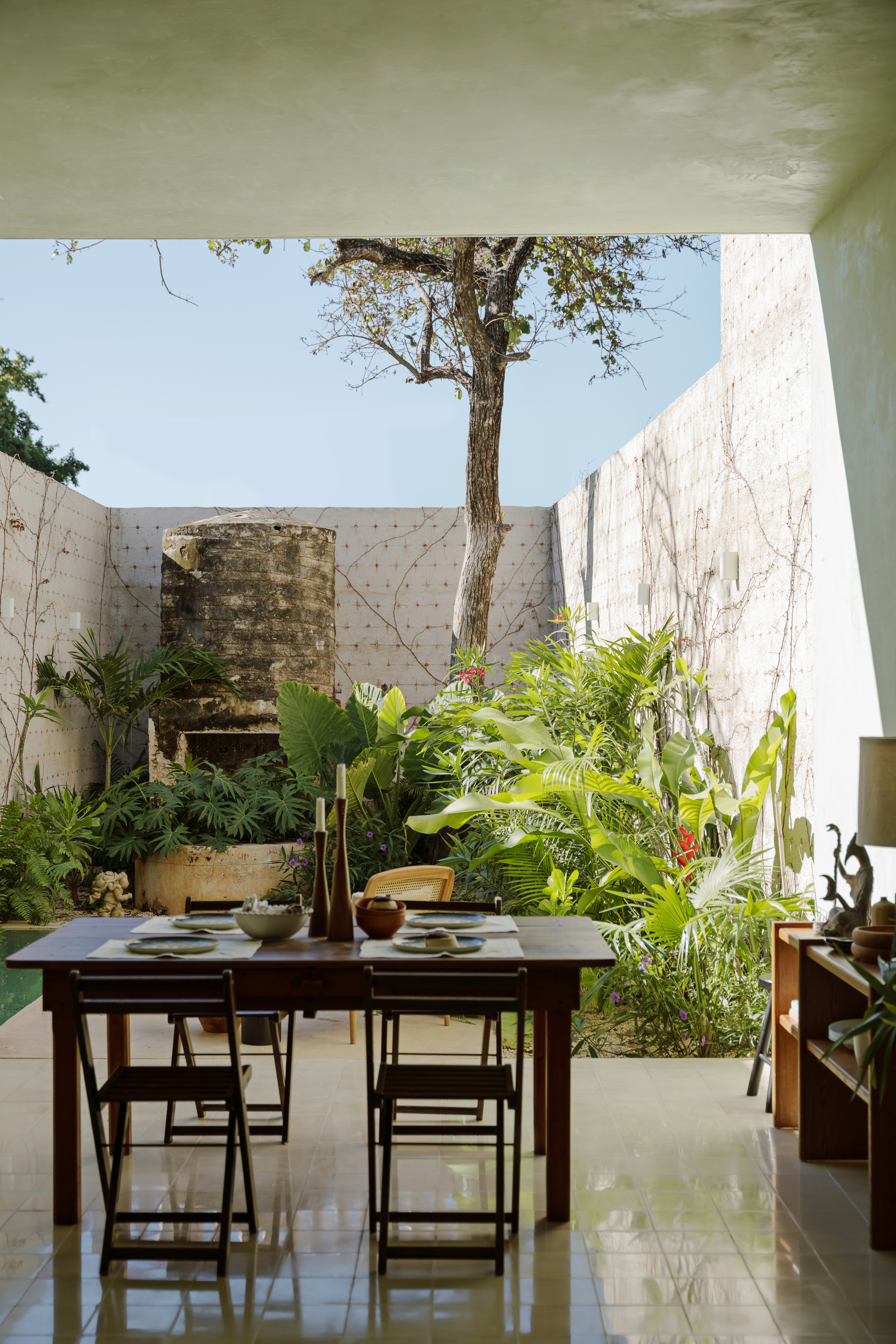 Toward the back, the home opens to the terrace and garden patio, where landscape and architecture meet. The original well was preserved as a historical vestige, alongside the former rooftop water tank reinterpreted as a sculptural decorative element — blending memory with contemporary design.