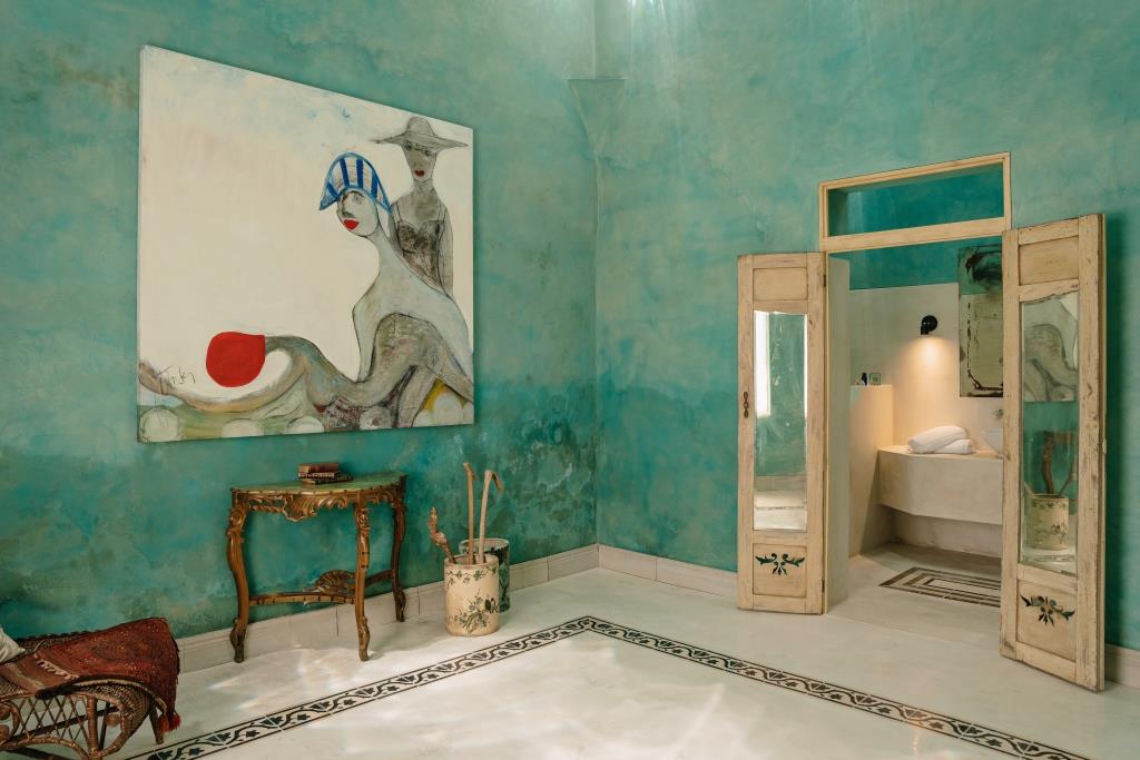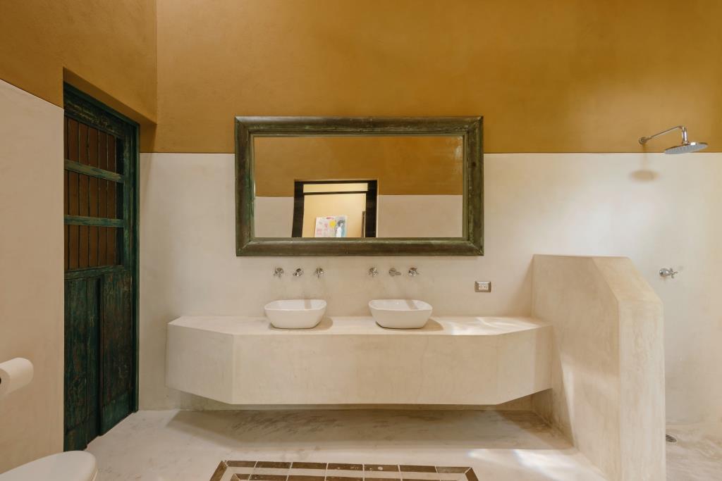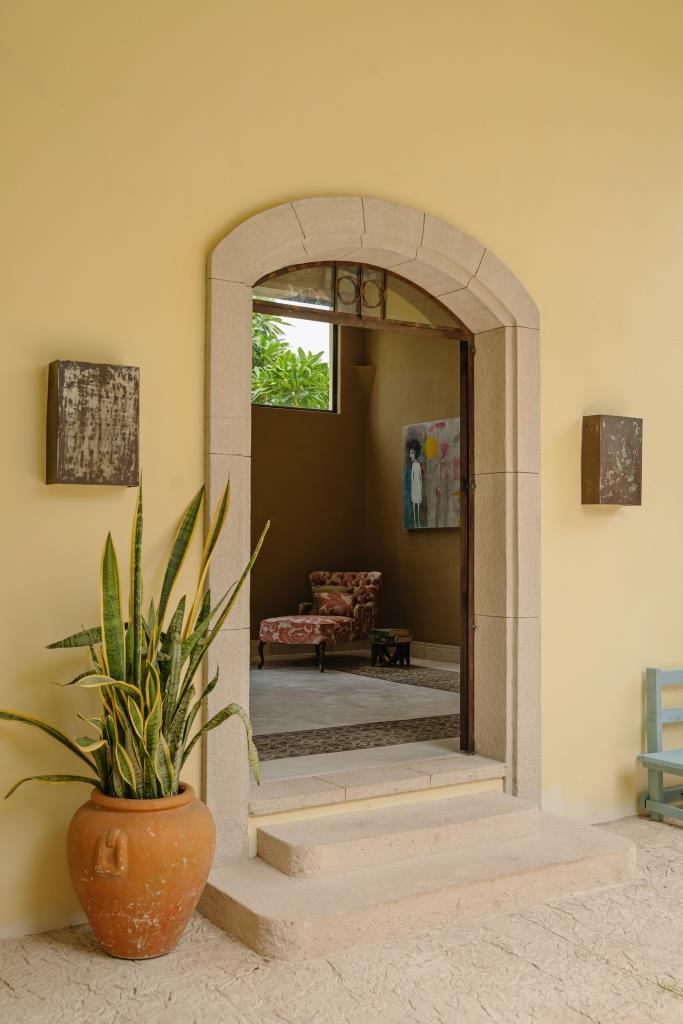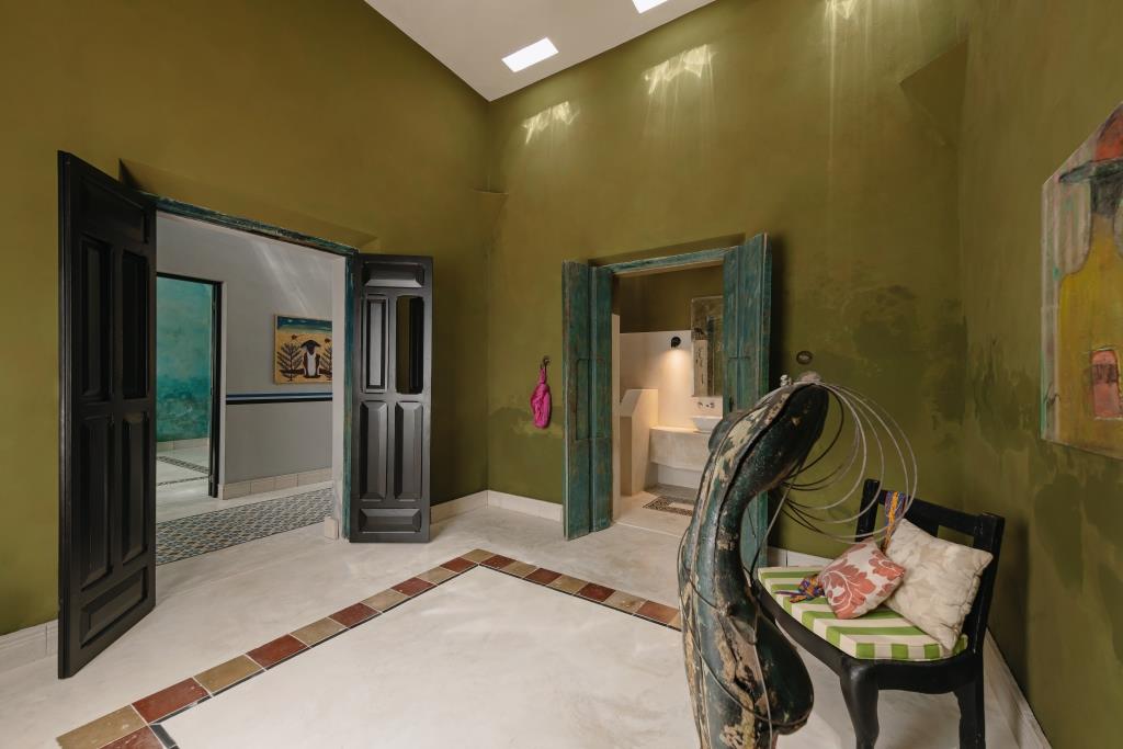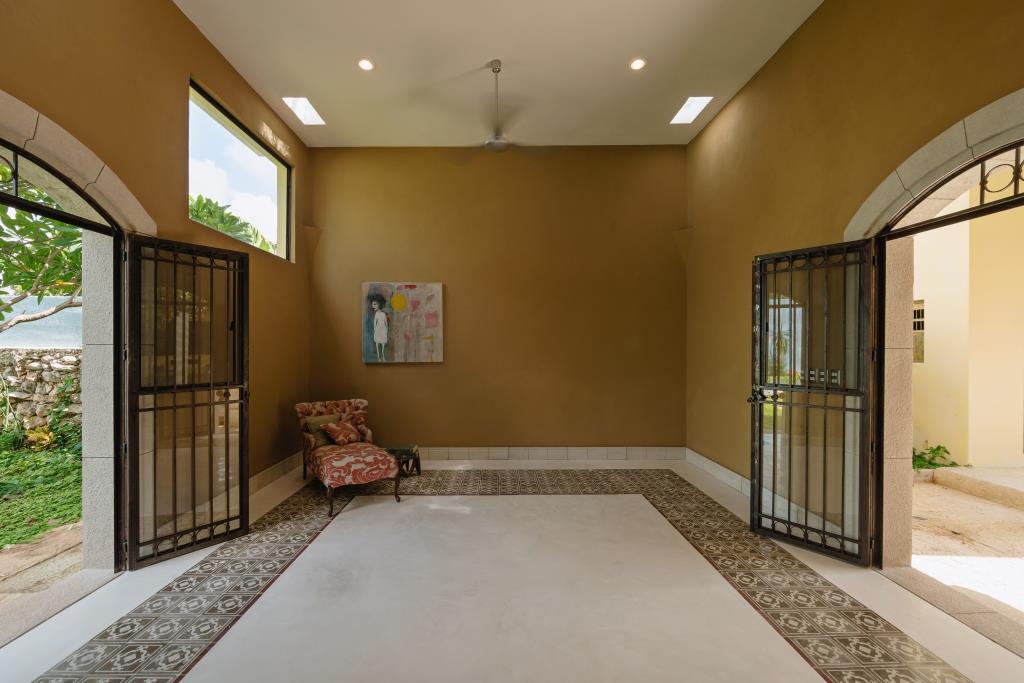 The façade preserves its original masonry (mampostería), discreetly integrating a garage without compromising the historic identity. Upon entering, subtle accents of green chukum appear on select walls, adding freshness and warmth.